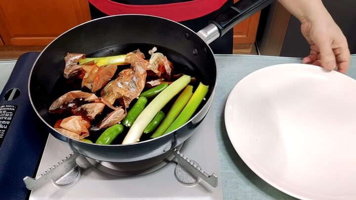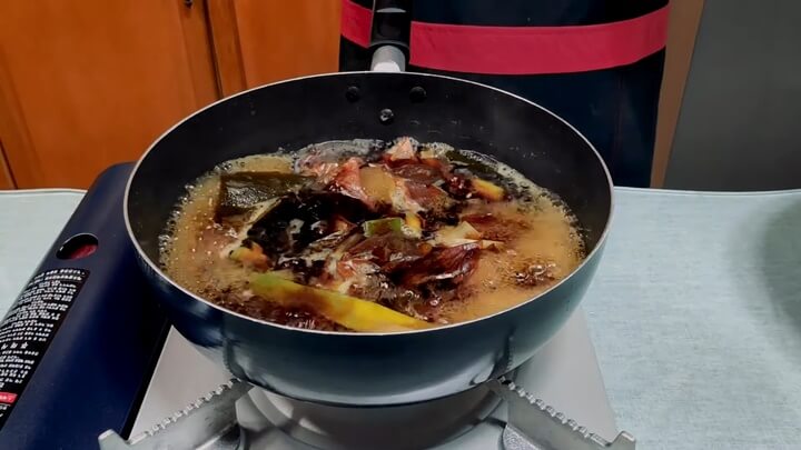 물과 간장을 넣은 것에 다시마 3조각, 대파 1뿌리, 청양고추 3개, 그리고 양파 껍질을 넣어줍니다. 양파 껍질이 없을 경우엔 양파를 넣어도 좋아요.