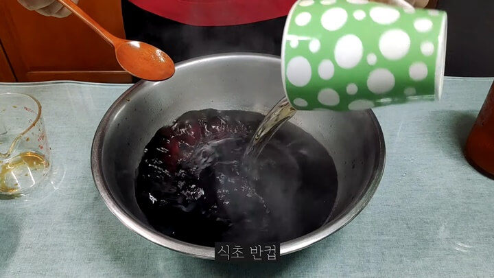 깨끗이 씻은 뒤 식초 2 숟갈 정도를 넣고 3분간 담가둡니다. 3분간 담가 둔 뒤 깨끗이 씻어서 헹군 후 물기를 빼서 준비해 둡니다.