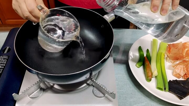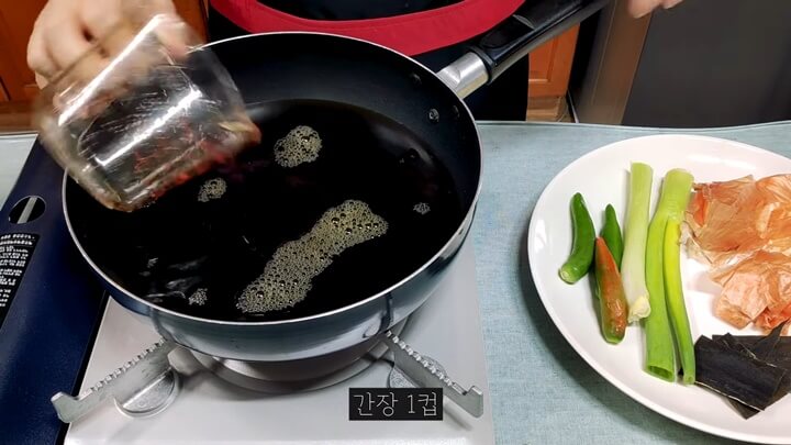 냄비에 물 2컵을 넣고 간장 1컵을 넣어줍니다. 그런 다음 채수를 만들어서 명이나물 장아찌를 만들 텐데요, 그냥 간장물보다 채수를 내어 만들면 더 깊은 맛이 나서 맛있어요.