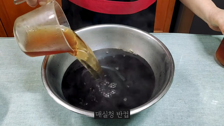 거른 육수에 식초 반컵, 매실청 반 컵, 설탕 반 컵을 넣고, 소주를 소주잔으로 한잔 넣어주세요. 소주는 방부제 역할을 해 주어서 두고 먹어도 명이나물이 물러지지 않아요.