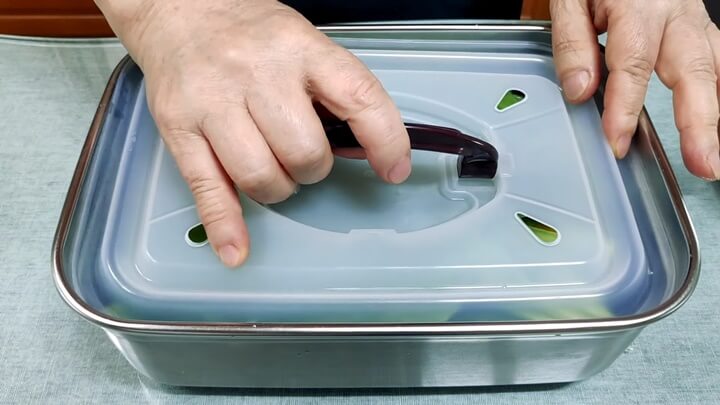 누름봉으로 꾹 눌러준 다음, 실온에서 하루 정도 둔 후에 냉장고에 넣어 보관하면 되고, 2주 정도 후에 먹으면 됩니다.