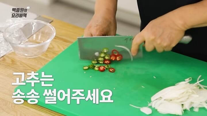 미역냉국은 새콤달콤 매콤한 맛이 나야 하는데요, 그래서 청양고추는 꼭 필요합니다. 홍고추는 모양과 색 내기 위한 것이니 없어도 됩니다.