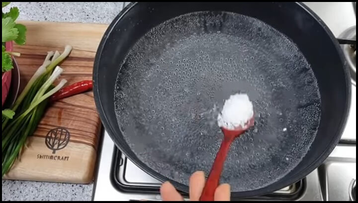 물이 끓으면 천일염 1큰술을 넣어서 녹여줍니다. 그리고 방풍나물을 넣어서 삶아줍니다.