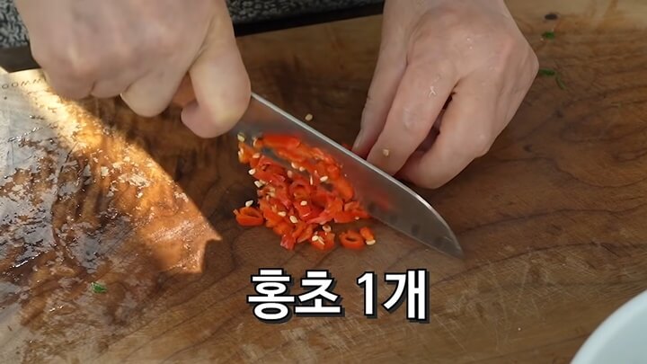 잘 씻은 방풍나물은 물기를 꼭 짜고, 먹기 좋게 듬성듬성 썰어주세요. 홍초 1개를 다져서 두가지 방풍나물 무침 버전에 반개씩 넣어줍니다.