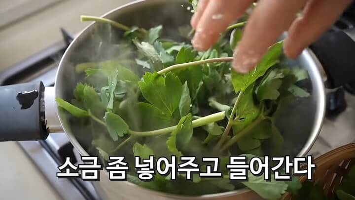냄비에 물을 끓이고, 물이 끓으면 소금을 조금 넣어준 다음 방풍나물을 넣어 삶아줍니다. 만약 방풍나물이 아닌 데쳐서 초장에 찍어먹을거라면 바로 건져내고, 방풍나물 무침으로 만들거라면 줄기를 눌렀을 때 들어갈 정도로 삶아주어야 해요. 냄비의 가장자리가 보글보글 끓을 때 건져내면 돼요.