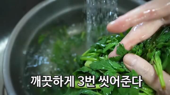 삶은 방풍나물은 건져서 찬물에 담가서 깨끗하게 3번 씻어주어요. 잘 삶아져서 방풍나물 줄기를 접었을 때 부드럽게 잘 휘어지고 잘 찢어져요.