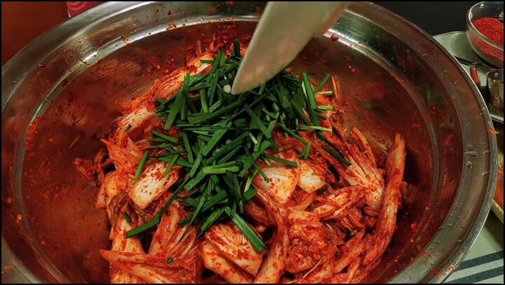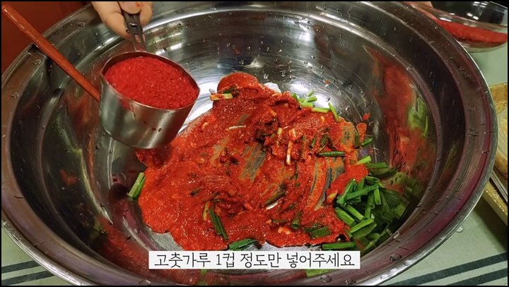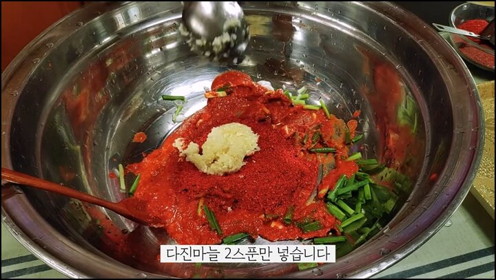 마지막으로 고춧가루 1스푼을 더 추가로 넣고 잘 버무려줍니다. 그런 다음 썰어 둔 부추를 모두 넣고 잘 섞어줍니다.