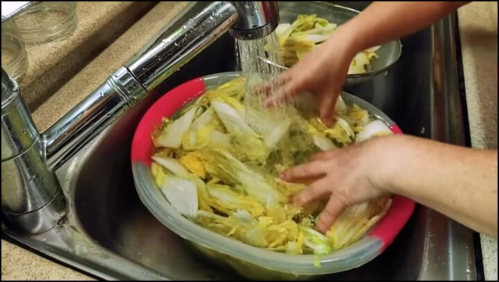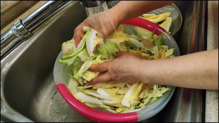 자른 배추는 물에 한번 씻어서 헹궈줍니다.