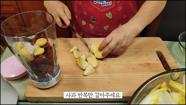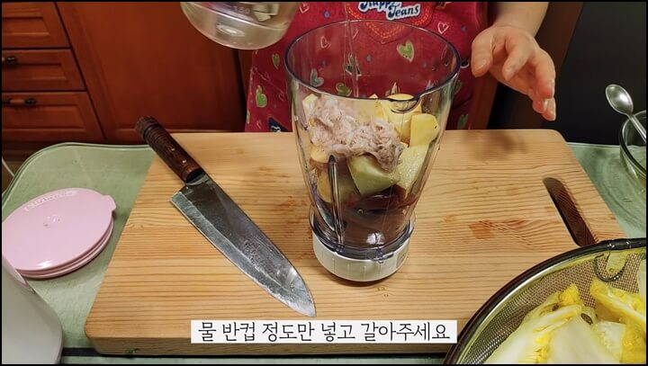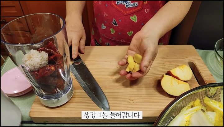 생강 1톨, 사과 반쪽, 새우젓 수북하게 1스푼, 물 반 컵 정도 넣고 믹서에 갈아줍니다.