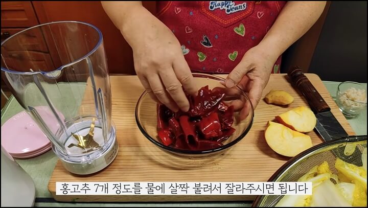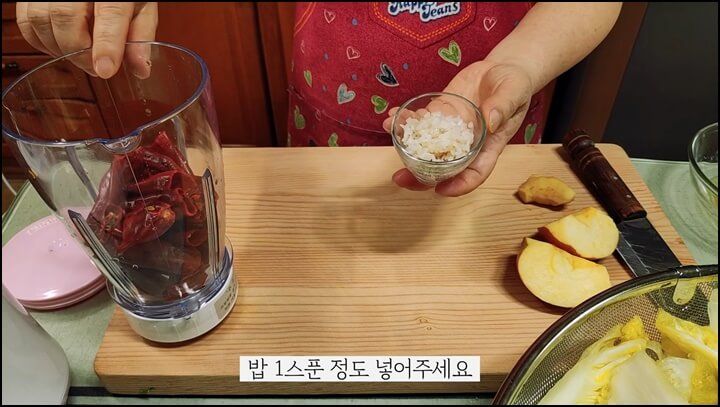 건고추 7개 정도 물에 살짝 불려서 적당한 크기로 잘라줍니다. 자른 건고추를 믹서에 담아주고, 밥 1스푼 정도 같이 넣어줍니다.