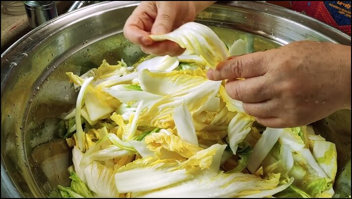 30분 정도 절이니 배추가 낭창낭창 야들해졌습니다. 절인 배추는 물에 세 번 정도 씻어서 헹궈줍니다.