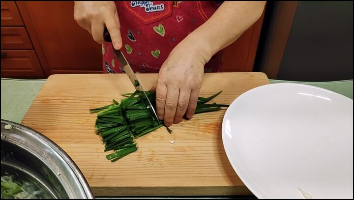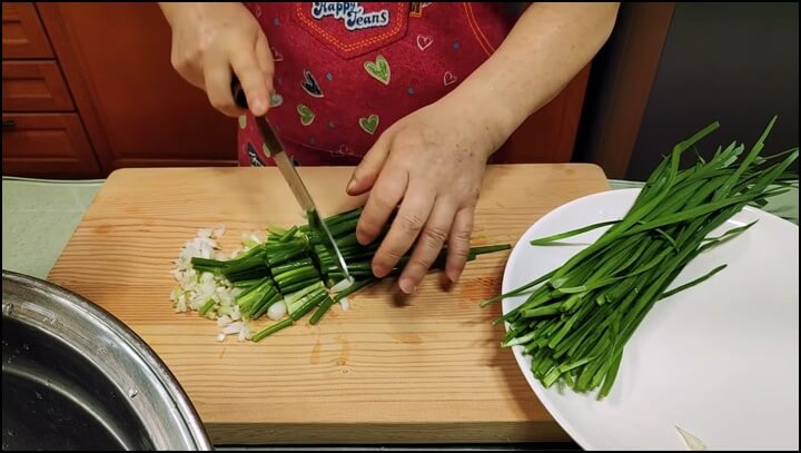 쪽파 한 줌은 머리 부분은 칼집을 낸 후 쫑쫑쫑 썰어주고, 줄기 부분은 3cm 정도의 길이로 썰어줍니다. 부추도 3cm 길이로 잘라줍니다.