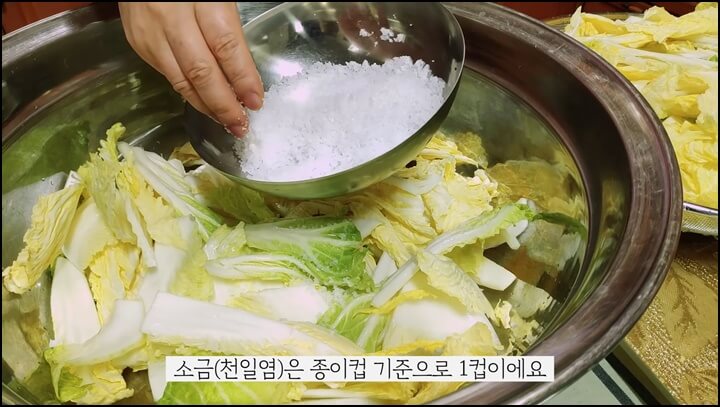 굵은소금 종이컵 1컵을 준비한 후 씻은 배추를 대야에 나눠 담고 소금을 뿌려줍니다. 그 위에 배추를 다시 깔고 소금을 뿌려주며, 이렇게 두세 번에 나눠 켜켜이 소금을 뿌려줍니다. 남은 소금은 물에 녹여서 뿌려주면 됩니다.