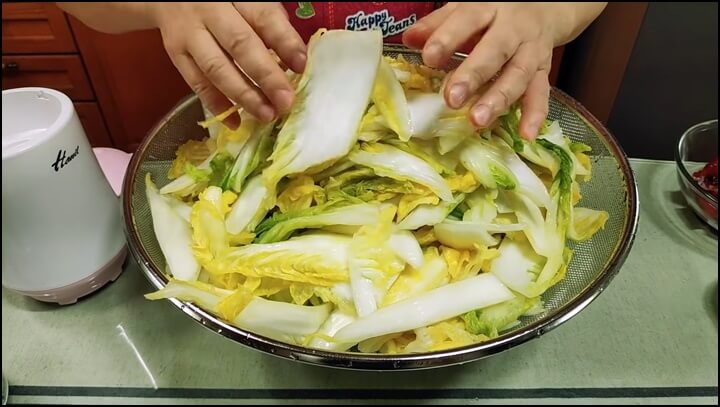 씻은 배추는 소쿠리에 담아 물기를 쏙 빼 줍니다.