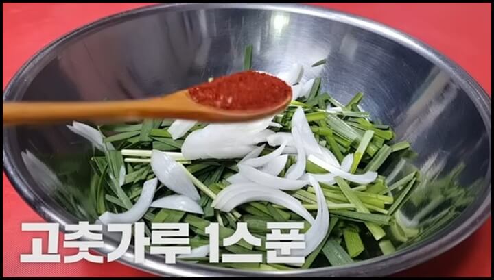 부추와 양파를 그릇에 담은 후 바로 양념을 합니다.