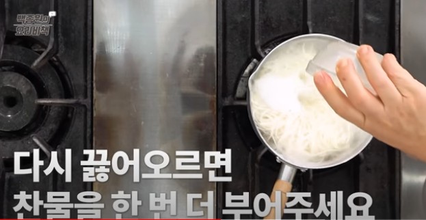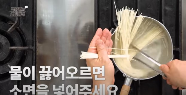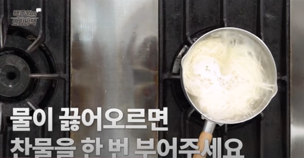 이렇게 국수가 끓어오를 때 찬물을 넣어주면 국수가 더 쫄깃하게 삶아진다고 해요. 국수가 세번째 끓어오르면 국수 맛을 보고 익었으면 불을 끕니다.