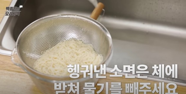 찬물에 헹군 소면은 체에 밭쳐서 물기를 빼 줍니다.
