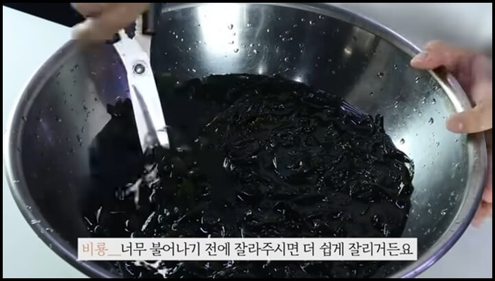 같은 재료를 사용하지만 어떻게 조리하느냐에 따라 맛은 천차만별인데요, 미역국의 가장 기본은 미역을 먼저 불려주는 것이죠. 미역은 총 20분 정도 불려주면 되는데 불린지 10분이 지나면 가위로 미역을 잘라줍니다. 20분을 다 불린 후에 잘라도 되지만 너무 불어나기 전에 자르면 더 쉽게 잘라집니다. 불린 후 10분이 지나서 미역을 먹기 좋게 잘라주고 나머지 10분을 더 불려줍니다.