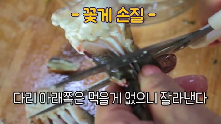 집게 다리도 잘라주어야 게의 맛있는 맛이 빠져나옵니다. 집게도 잘라줍니다.