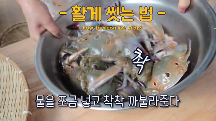 활꽃게를 씻을 때는 대야에 물을 조금 넣고 착착 까불러줍니다. 솔로 껍질을 잘 문질러 씻은 다음, 배딱지를 젖혀서 떼 주고, 게딱지를 열어줍니다.