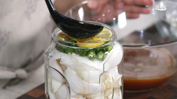 설탕과 소금이 다 녹았으면 양파를 담은 유리병에 간장물을 부어줍니다. 레몬 위로 장물을 부어주면 레몬을 지나 청양고추를 지나 양파로 가기 때문에 레몬맛과 매콤한 맛이 배어서 내려가고 또 특히 골마지가 끼지 않는다고 해요.