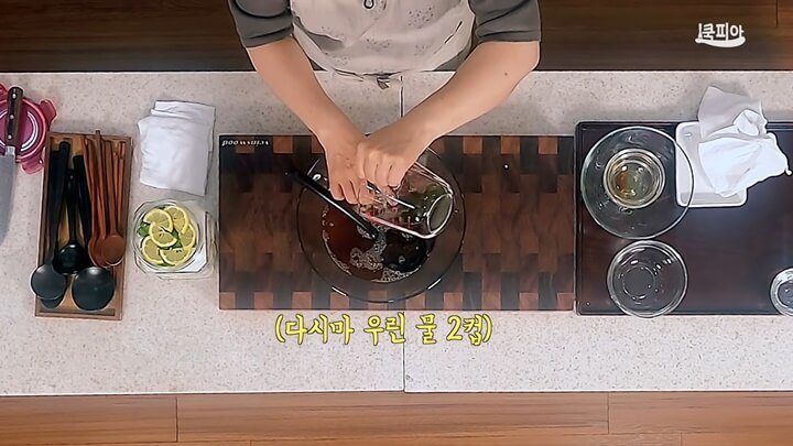 간장과 식초, 설탕을 잘 녹게 하면서 맛을 잘 나게 하는 것이 있으니 그것은 바로 다시마 우린 물이에요. 다시마 우린 물은 건다시마 사방 5cm 크기 2장을 생수 2컵에 넣어 30분간 담가 두어 만들어요.