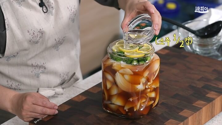 여기서 끝이 아니랍니다. 양파장아찌 담그는법의 비장의 무기 한 가지 더! 바로 소주입니다. 소주 1/2컵을 넣어주면 골마지가 끼지 않고, 잡내 제거 및 방부제 역할을 해 주어요. 소주의 알코올은 날아가니 걱정 않으셔도 돼요.