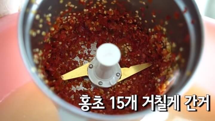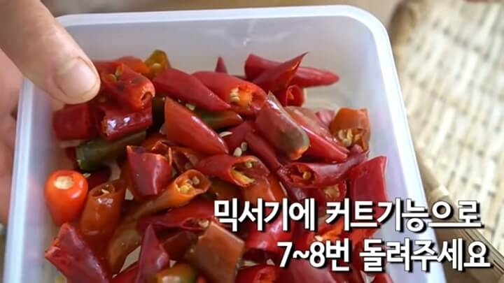 홍고추는 적당한 크기로 잘라 믹서기에 넣고 커트 기능으로 7~8번 돌려주어요. 이렇게 커트해서 넣어 고명 효과를 내줍니다.