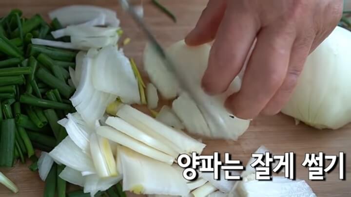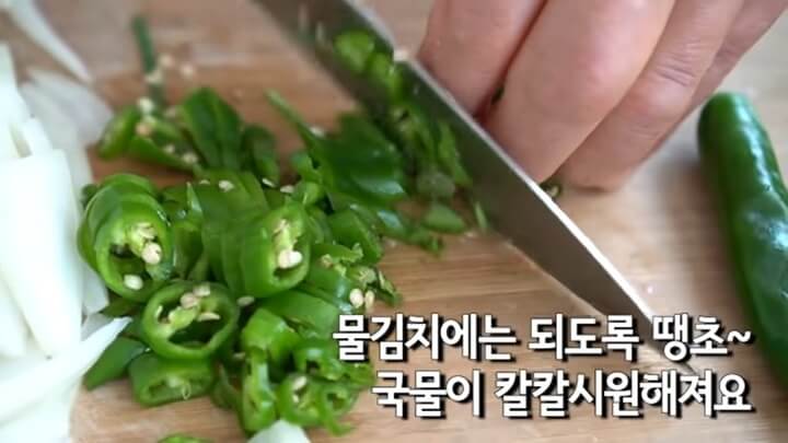 쪽파는 2cm 정도의 길이로 잘라주고, 뿌리 쪽 굵은 것은 반으로 갈라주세요. 양파는 잘게 썰어주고, 청양고추도 잘게 썰어줍니다. 물김치에는 되도록이면 땡고추를 넣어주는 것이 국물이 칼칼하고 시원해서 좋아요.