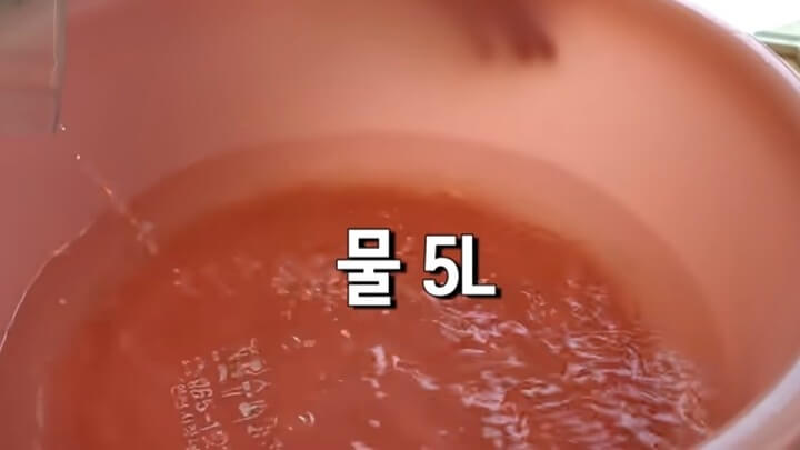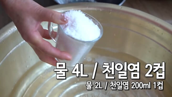 물 4리터에 천일염 2컵을 넣어 녹입니다. 물 2리터 당 천일염 200ml 1컵 비율로 맞춰 소금물을 만들면 됩니다.