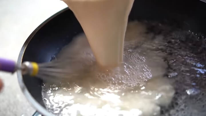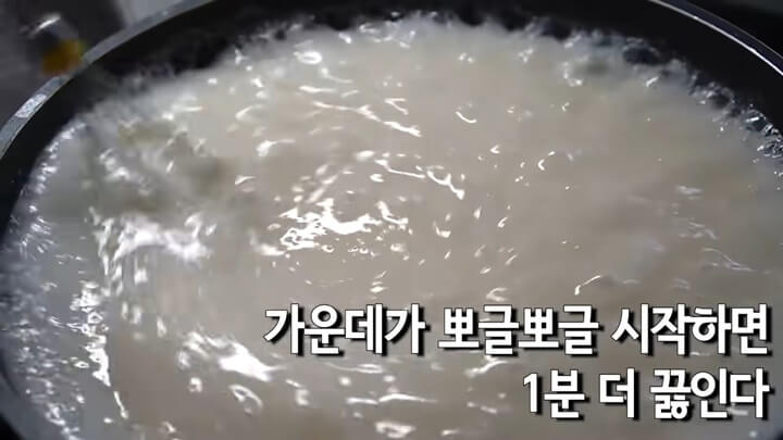 물이 끓으면 밀가루 푼 물을 부어줍니다. 저어가며 끓이다가 풀국 가운데가 끓고 1분 이상 더 끓여주어야 밀가루 맛이 나지 않아요. 풀을 제대로 오래 끓여줘야 풀내가 나지 않는다고 하니 바닥이 눋지 않게 계속 저어가며 끓여줍니다.