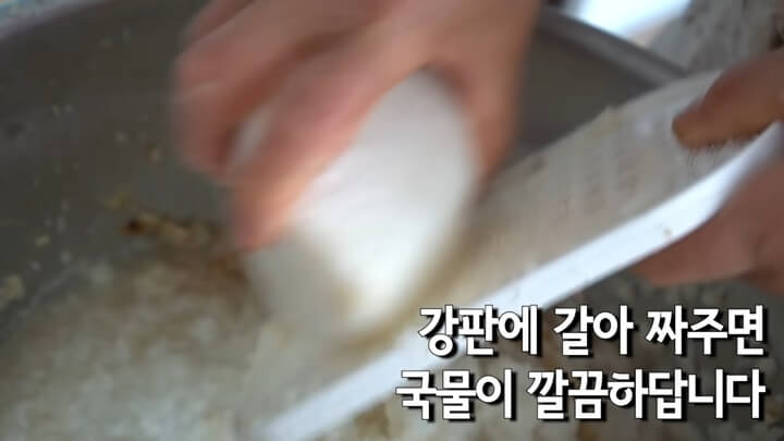 이렇게 강판에 갈아서 즙을 짜서 넣으면 국물이 깔끔하고 맛있어요.