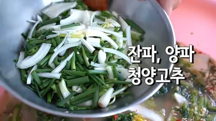 마늘 수북하게 2 숟갈, 생강 0.7 숟갈을 넣고, 쪽파, 양파, 청양고추 썬 것을 넣어줍니다. 골고루 잘 섞은 후 최종 간은 소금으로 맞춰줍니다.