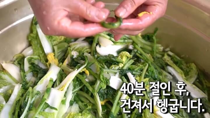 40분 절인 열무는 구부렸을 때 부드럽게 휘어져요. 절여진 열무와 배추는 건져내서 물에 한 번만 가볍게 헹궈주세요. 소금간물을 가볍게 한번 헹궈서 소금의 쓴맛을 빼 주어요. 너무 헹구면 열무가 다시 살아나니 가볍게 한번만 헹궈주세요.