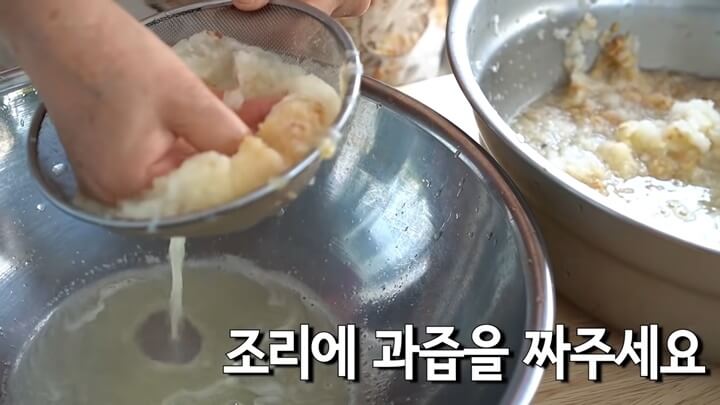 강판에 간 무, 배, 사과는 체에 담아서 즙을 짜 주어요. 체나 면포에 넣고 짜면 돼요.