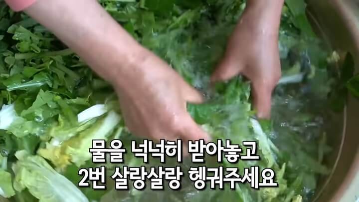 다듬은 열무와 배추는 물을 넉넉히 받아서 두 번 정도 살랑살랑 씻어서 헹궈주세요.