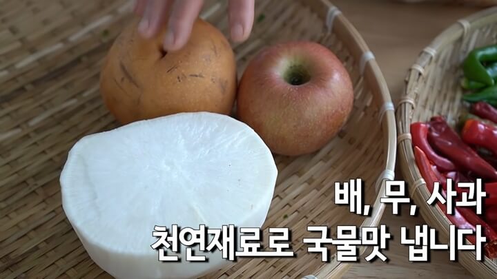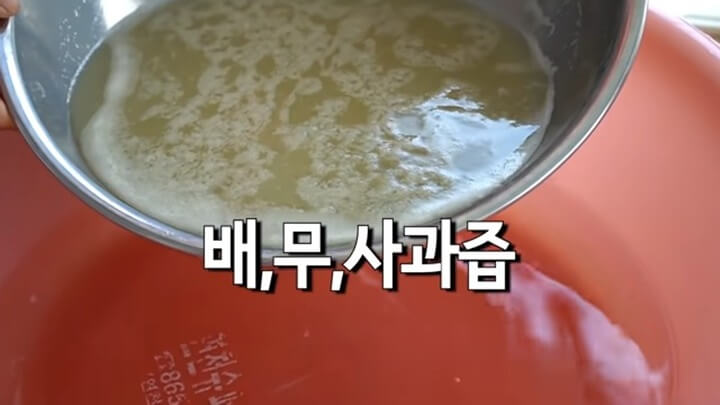 배, 사과, 무를 갈아 넣어 천연 단맛을 내줍니다. 배, 사과, 무를 강판에 갈아 즙만 짜서 국물에 넣어주어요, 강판에 갈기 힘들면 믹서기에 갈아서 즙만 짜도 되는데, 믹서기보다는 강판에 갈아서 짜주는 게 더 낫다고 해요.