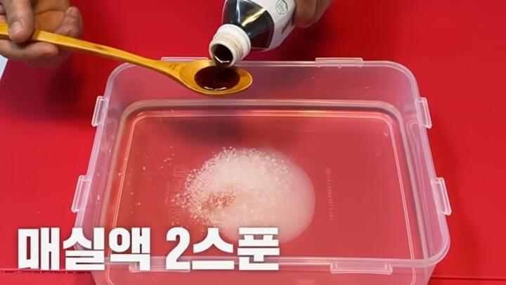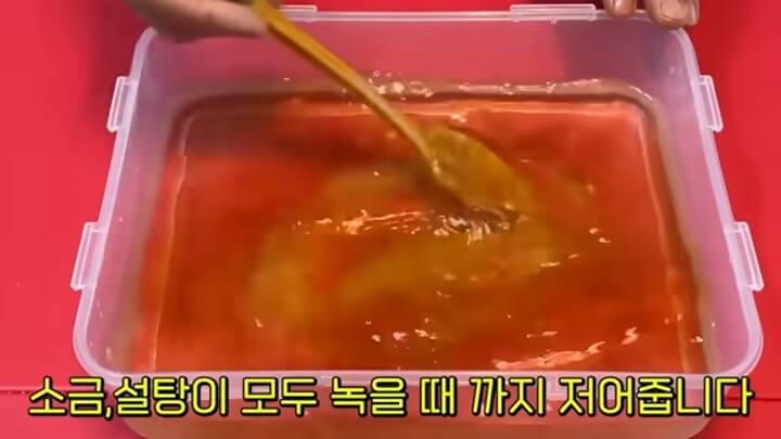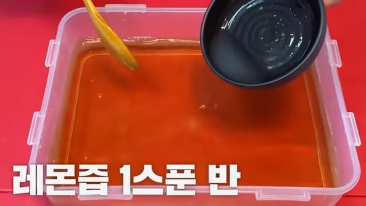 소금과 설탕이 모두 다 녹을 때까지 잘 저어줍니다. 소금과 설탕이 어느 정도 다 녹았으면 레몬즙 1스푼 반을 넣어줍니다.