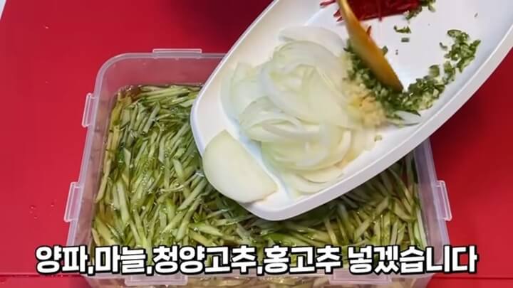 양념이 끝난 냉국에 오이 채 썰어 둔 것을 모두 넣어줍니다. 양파와 마늘, 청양고추, 홍고추 썰어 둔 것도 모두 넣어주세요.