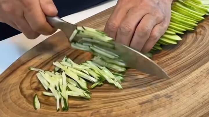 백오이 2개의 양 끝을 잘라주는데, 초록색 쪽은 약간 더 썰어줍니다. 어슷 썰기를 한 다음 채 썰어줍니다.