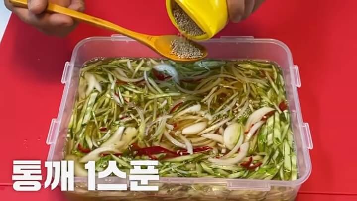 통깨 1스푼 넣고 잘 저어주세요. 이렇게 하면 오이냉국은 완성이고요, 드실 때 얼음을 넣어서 시원하게 드시면 됩니다.