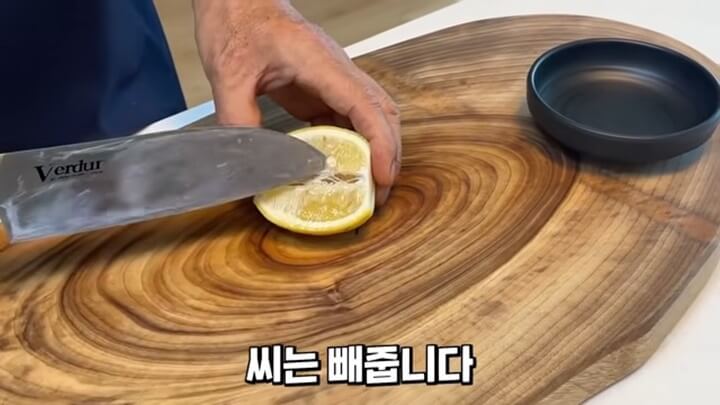 레몬 반 개는 씨를 빼 주고 손으로 눌러 레몬즙을 짜 주세요. 레몬 반 개 짜면 1스푼 반 정도의 레몬 즙이 나와요.