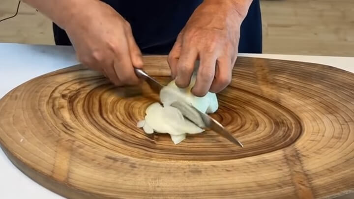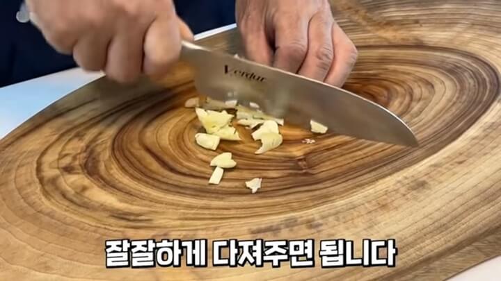마늘 2개는 칼등으로 눌러서 잘게 다져주세요. 이렇게 다져서 넣으면 식감이 있어 오이냉국이 더 맛있어져요. 마늘은 식감이 있어야 하는데 간 마늘을 넣는 것보다 이렇게 다져서 넣는 것이 훨씬 좋아요.