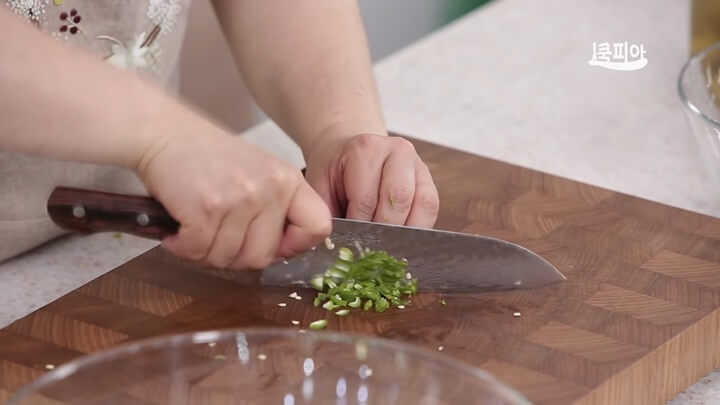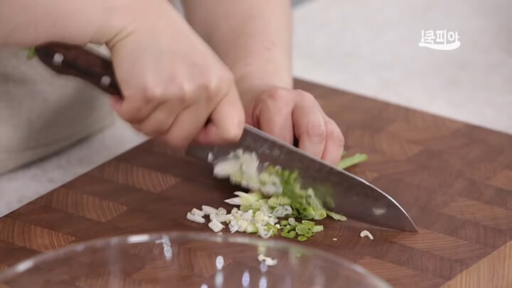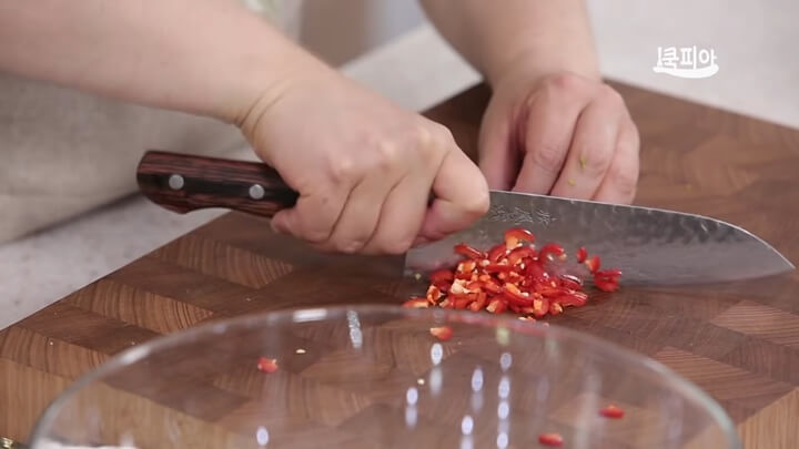 쪽파 3대를 다져주고, 홍고추, 청양고추도 잘게 다져주세요. 다진 마늘 1/2큰술, 고춧가루 1큰술 반, 감칠맛을 위해 국간장 살짝, 매실청 1큰술 넣어준 후 손으로 조물 조물 무쳐주세요.