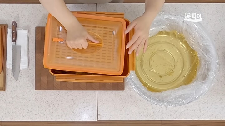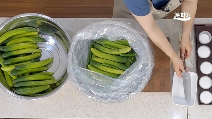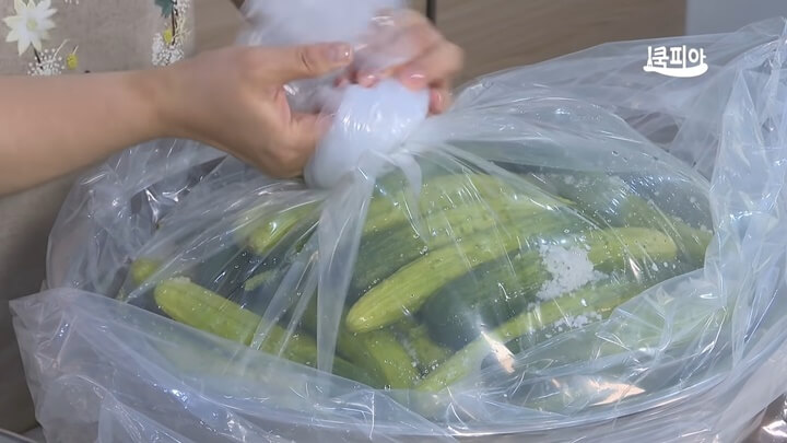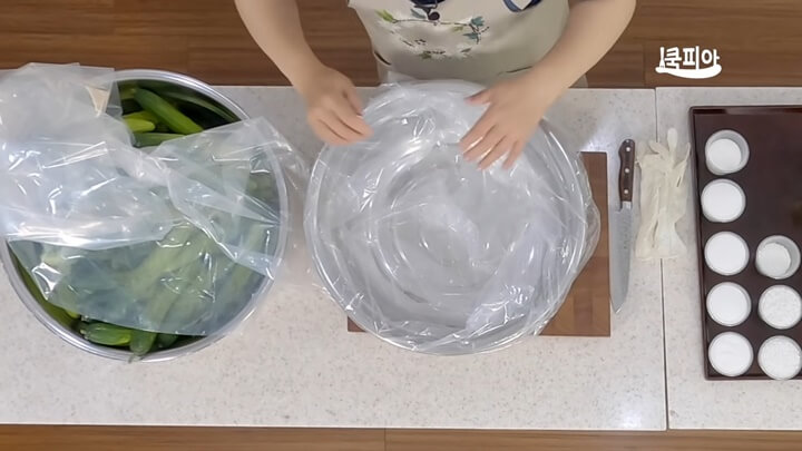 큰 대야를 준비하고 김장봉투 2장을 대야 안에 겹쳐서 담아주세요. 2겹으로 해야 오이 안에서 생긴 물이 바깥으로 흘러나오지 않아요.
