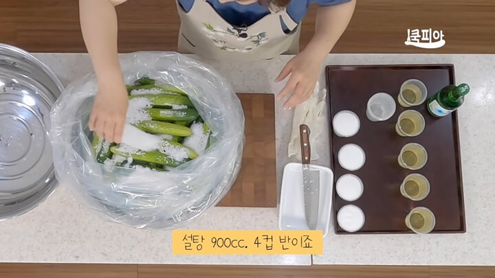 그리고 또 한가지! 12월까지 오래 두고 먹기 위해서는 오이 50개에 올리고당 750ml를 뿌려준다고 해요. 이렇게 오이에 올리고당을 뿌려서 당침을 만들어 주어요.