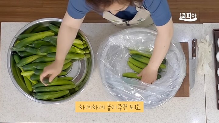 김장 비닐 안에 오이를 차곡차곡 가지런히 놓아줍니다. 차례대로 가지런히 놓게 되면 오이에 절임물이 골고루 스며들 수 있어요.