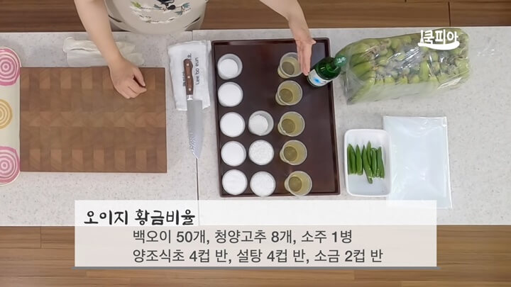 백오이 50개에 청양고추 8~10개, 소주 360ml 짜리 1병, 식초 4컵 반, 설탕 4컵 반, 소금 2컵 반을 준비하면 오이지 황금비율이 됩니다.