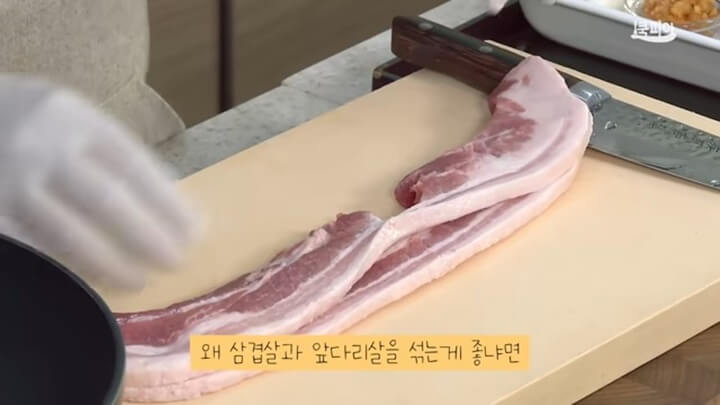 제육볶음에 사용하는 돼지고기는 어느 부위가 좋을까요? 이보은 요리연구가님이 추천하시는 바로는 삼겹살과 앞다리살을 함께 섞어서 사용하는 것입니다. 왜냐면 삼겹살은 지방이 풍부하고, 앞다리살은 살코기가 많기 때문에 이 둘을 함께 섞어서 만들면 식감도 좋고 맛도 더욱 좋습니다.