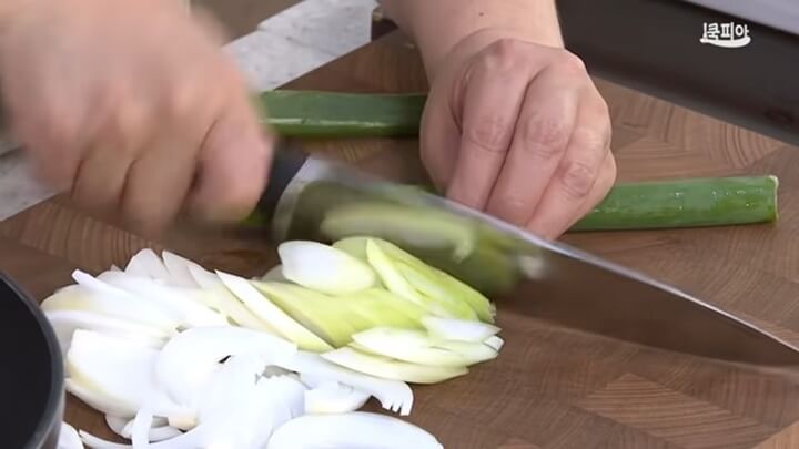양파는 굵게 채 썰고, 대파는 어슷 썰어서 준비합니다. 대파의 초록 잎 부분에는 쓴맛이 도는 점액질이 있으니 조금만 넣어줍니다.
